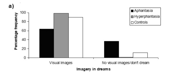 Most strikingly, people with aphantasia were more likely than those with average or vivid imagery to report an absence of dreams, or a-visual dreaming. Nonetheless, a majority (63.4%) of people with aphantasia report that they dream visually, in common with 98.5% of people with hyperphantasia and 89% of people with mid-range imagery vividness.