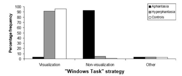aphantasics were significantly less likely to use visual imagery for this, and were “significantly more likely to use alternative, non-imagery, strategies including the use of avisual spatial imagery, kinaesthetic imagery and amodal ‘knowledge’”